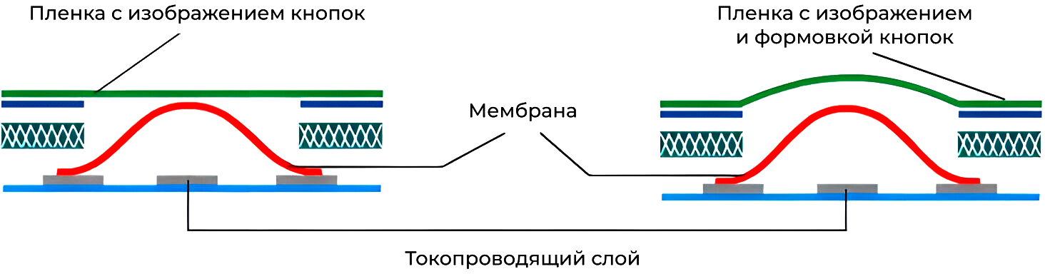 Это сложный технологический процесс, включающий этап установки металлических мембран-замыкателей разных размеров и имеющих определенные показатели эксплуатации. Проведенные на контрольно-измерительном оборудовании испытания показали, что мембранно-пленочная клавиатура выдерживает до 5 млн. нажатий. Применение мембран обеспечивает четкий тактильный эффект при взаимодействии. При давлении на клавишу происходит прогиб находящейся под ней пластинки (мембраны) и замыкание.